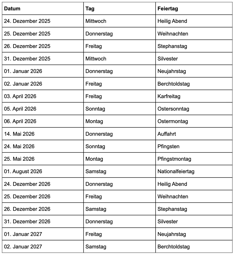 An den Feiertagen* ist unser Betrieb von 09.00 bis 16.00 Uhr für Sie geöffnet.
